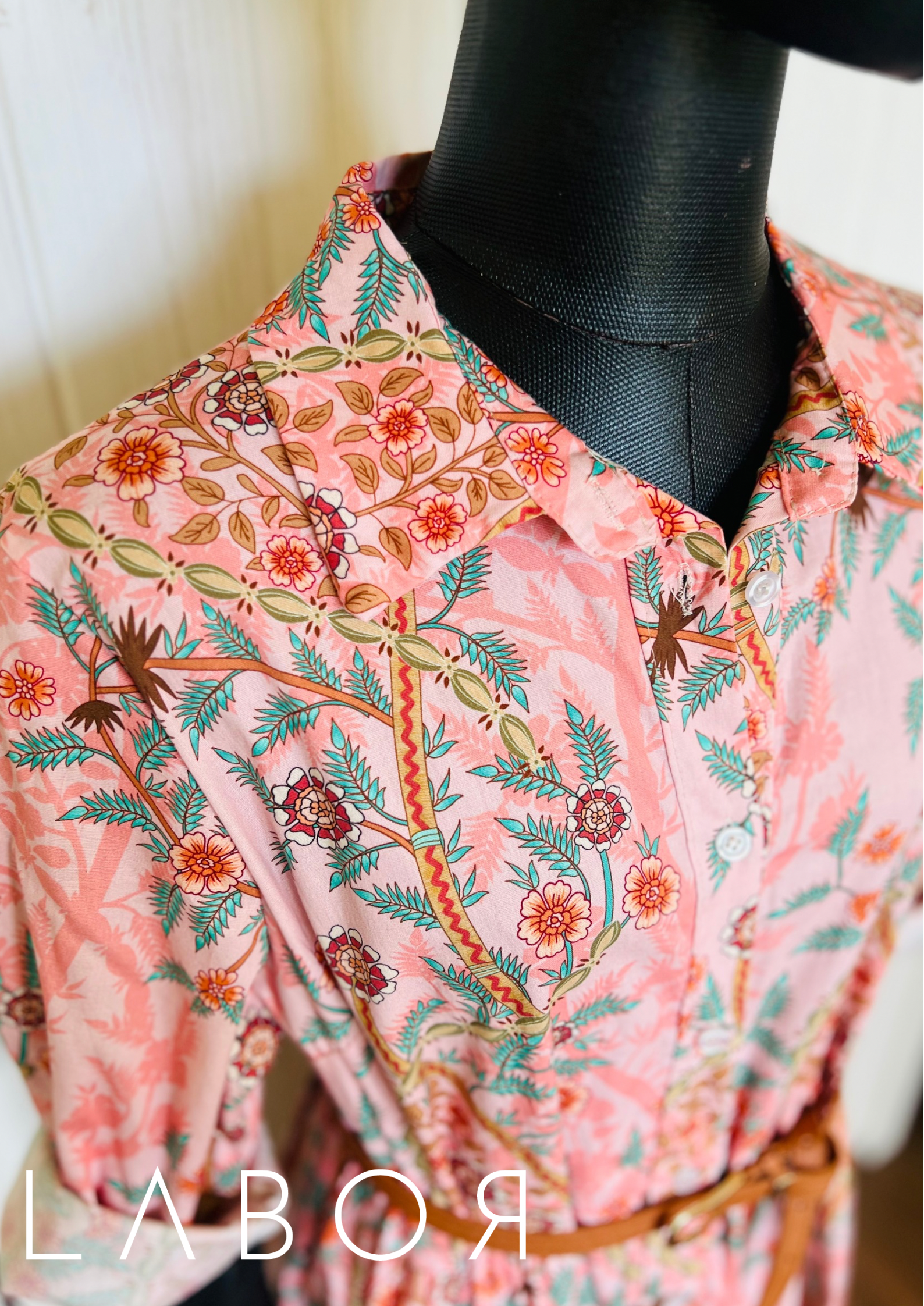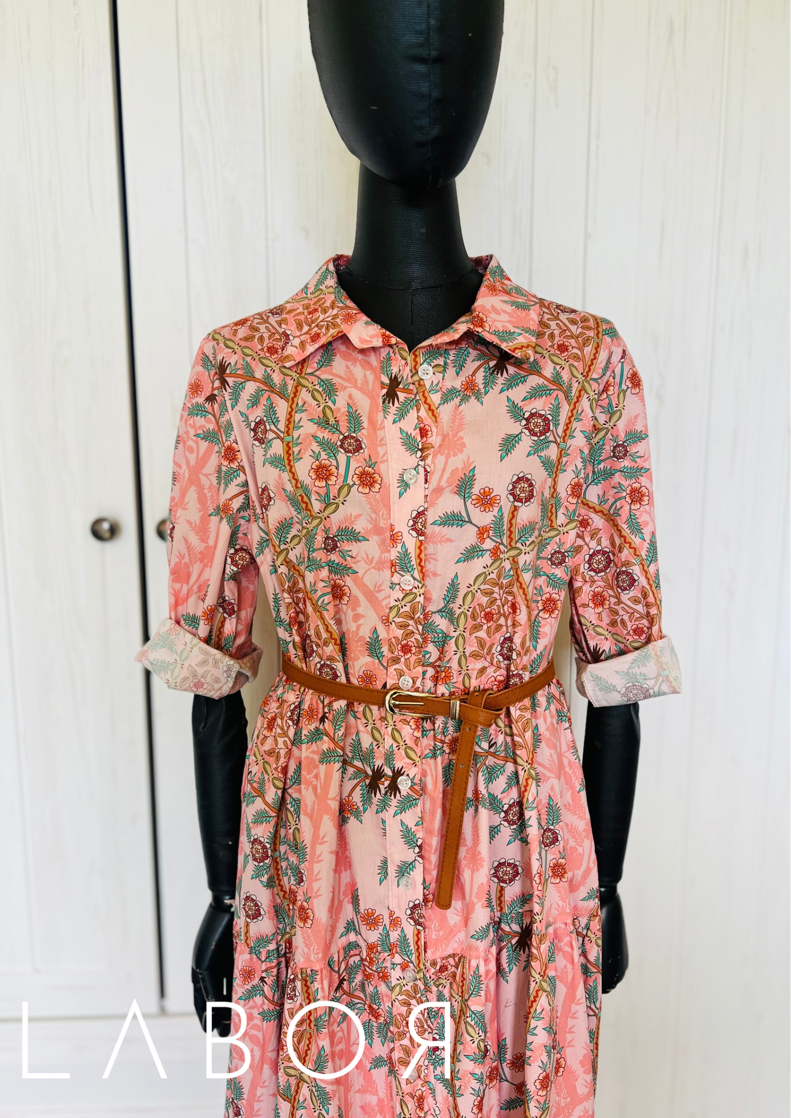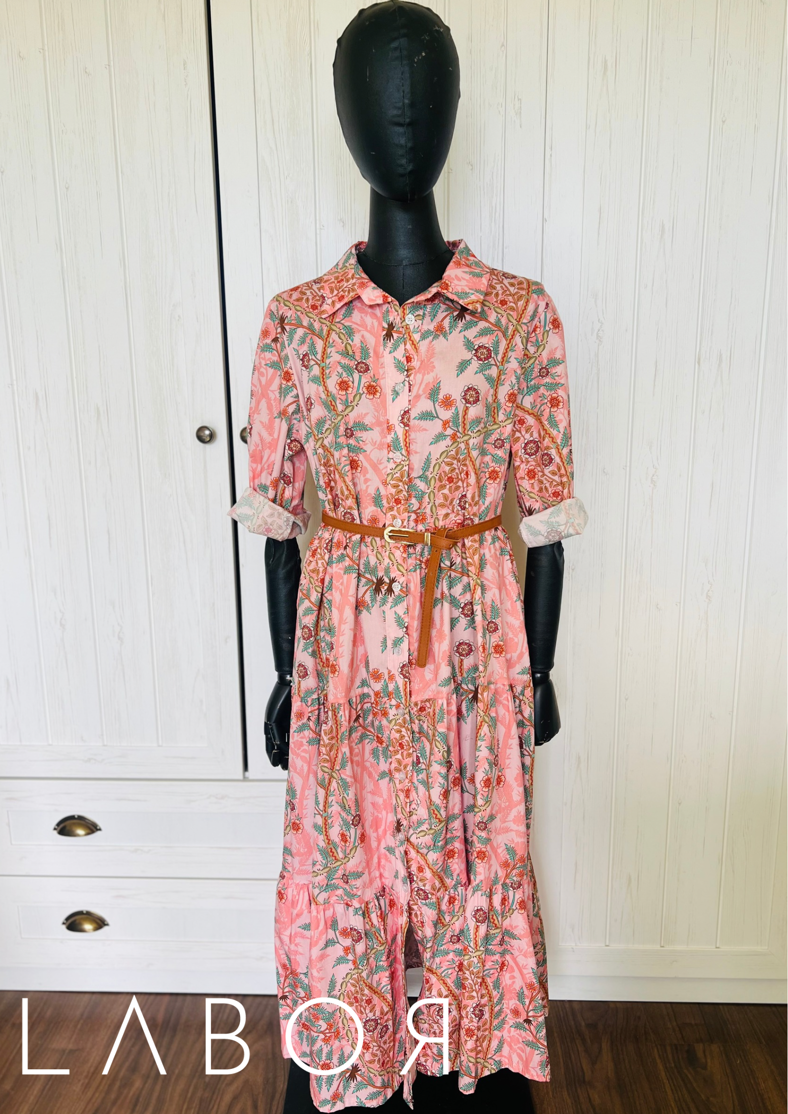 Kényelmes, lenge pamut anyagból készült maxi ingruha barna övvel.
