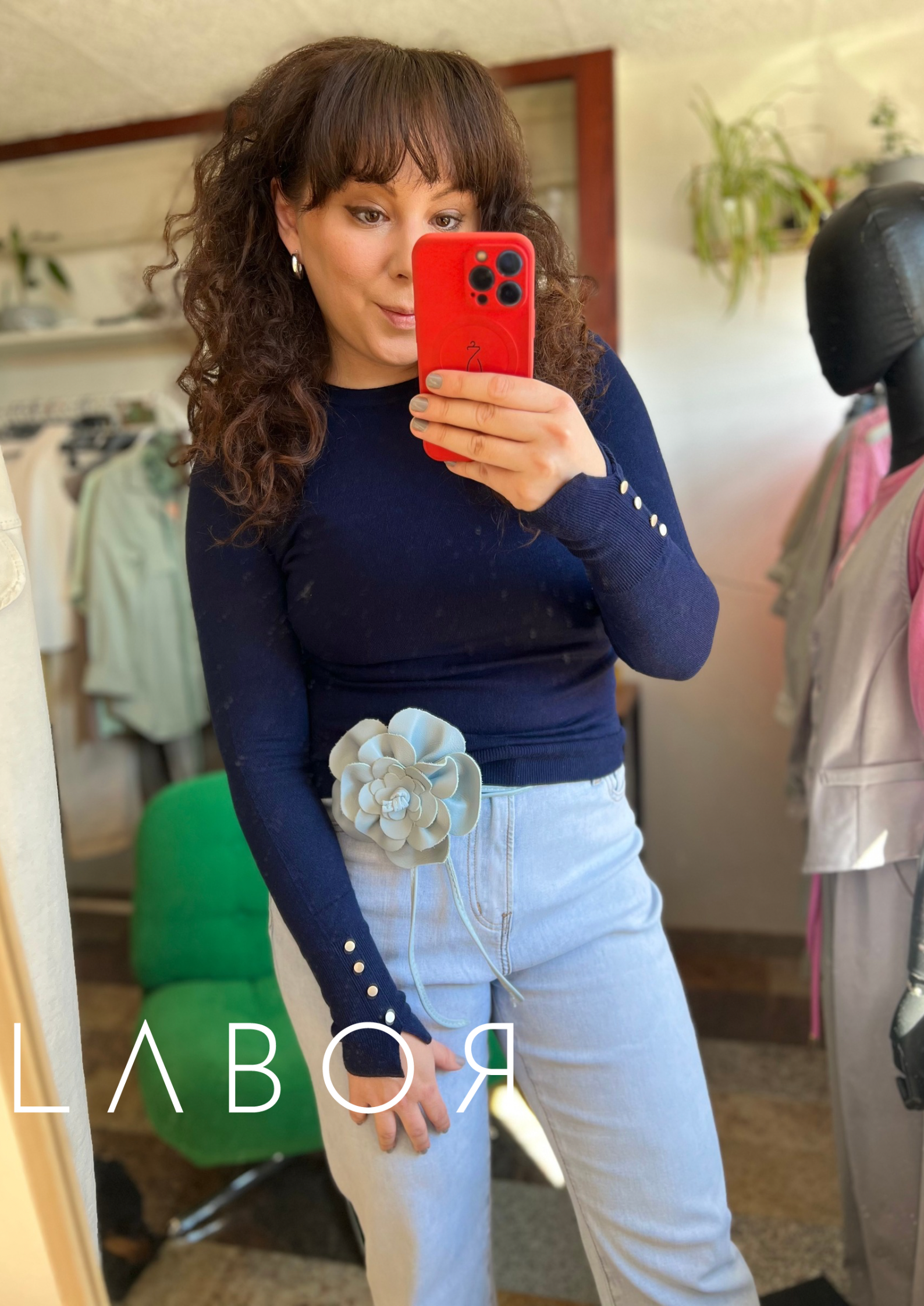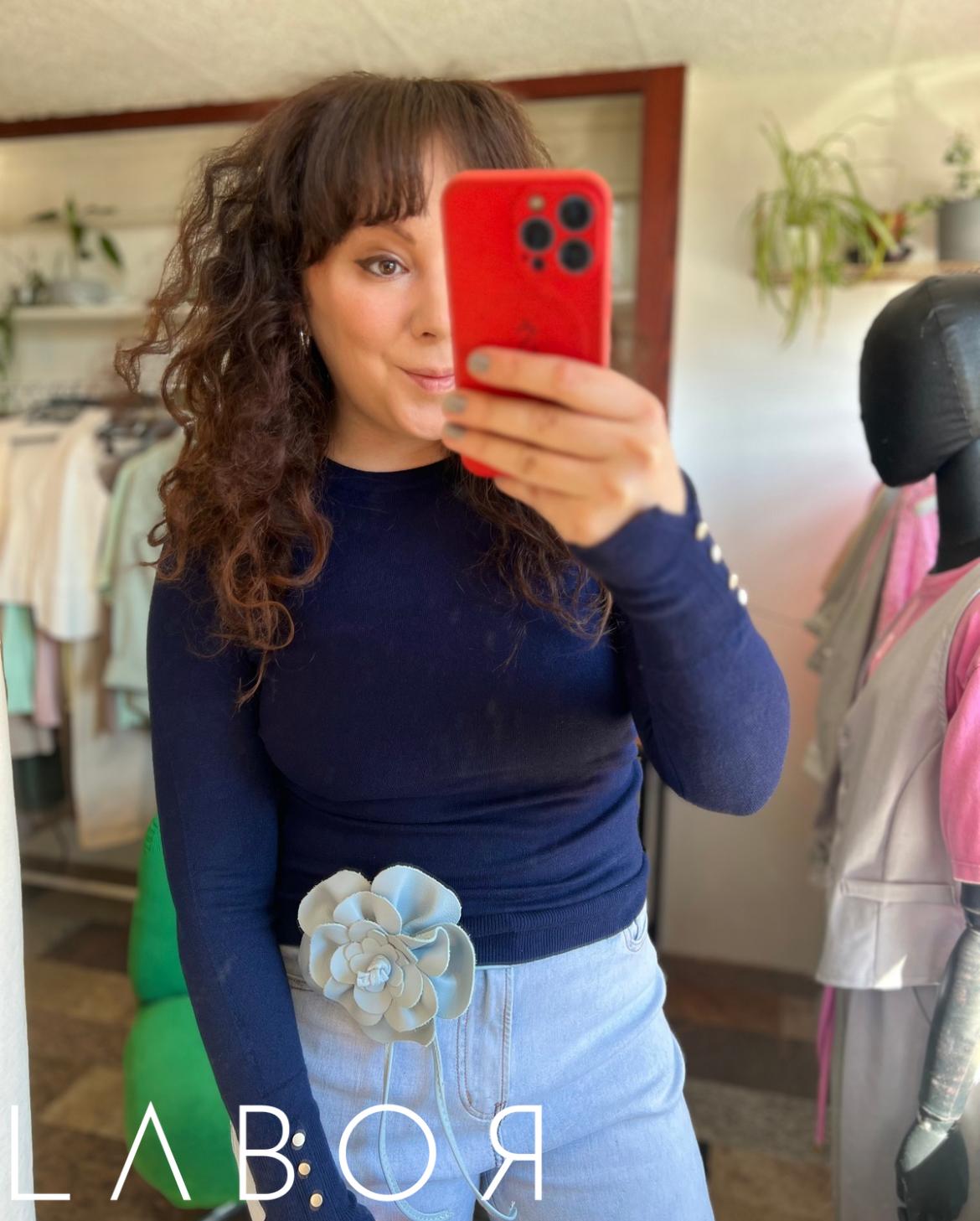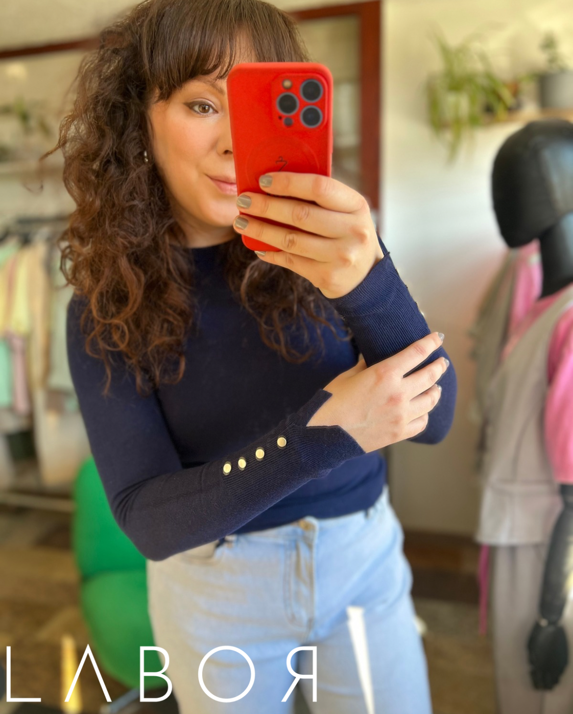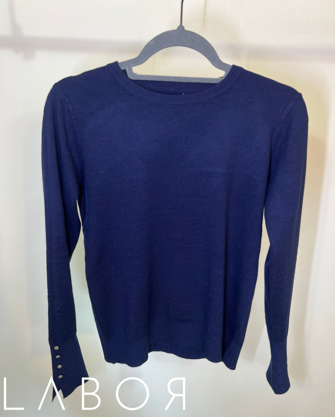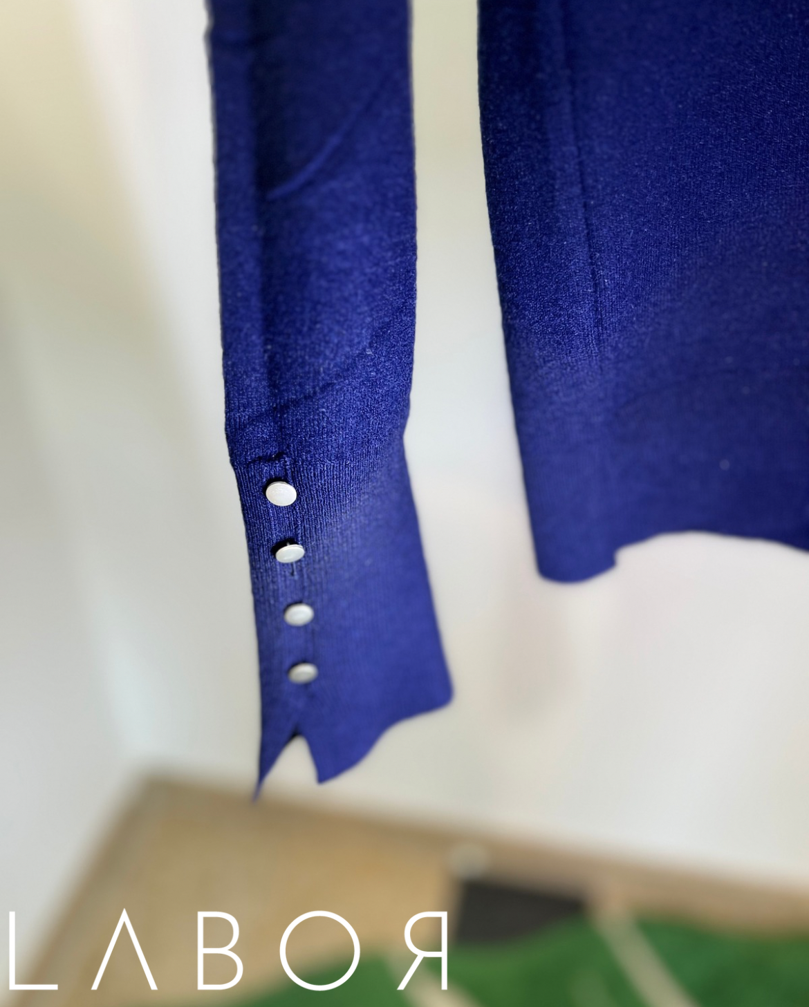 Finom kötött pulóver, puha, rugalmas anyagból. A pulóver ujján ezüst gomb díszítéssel és hasítékkal. Karcsúsított fazon.