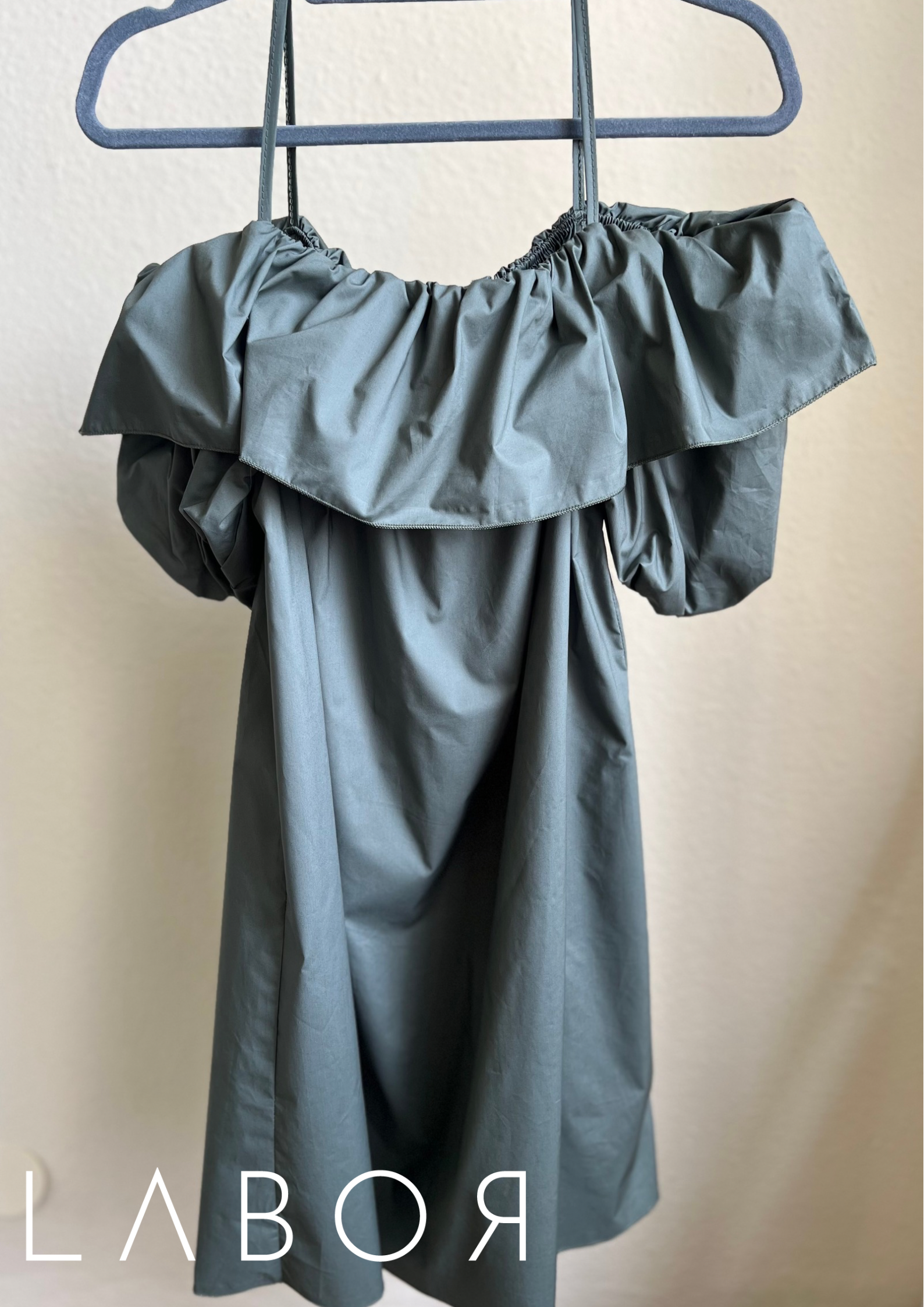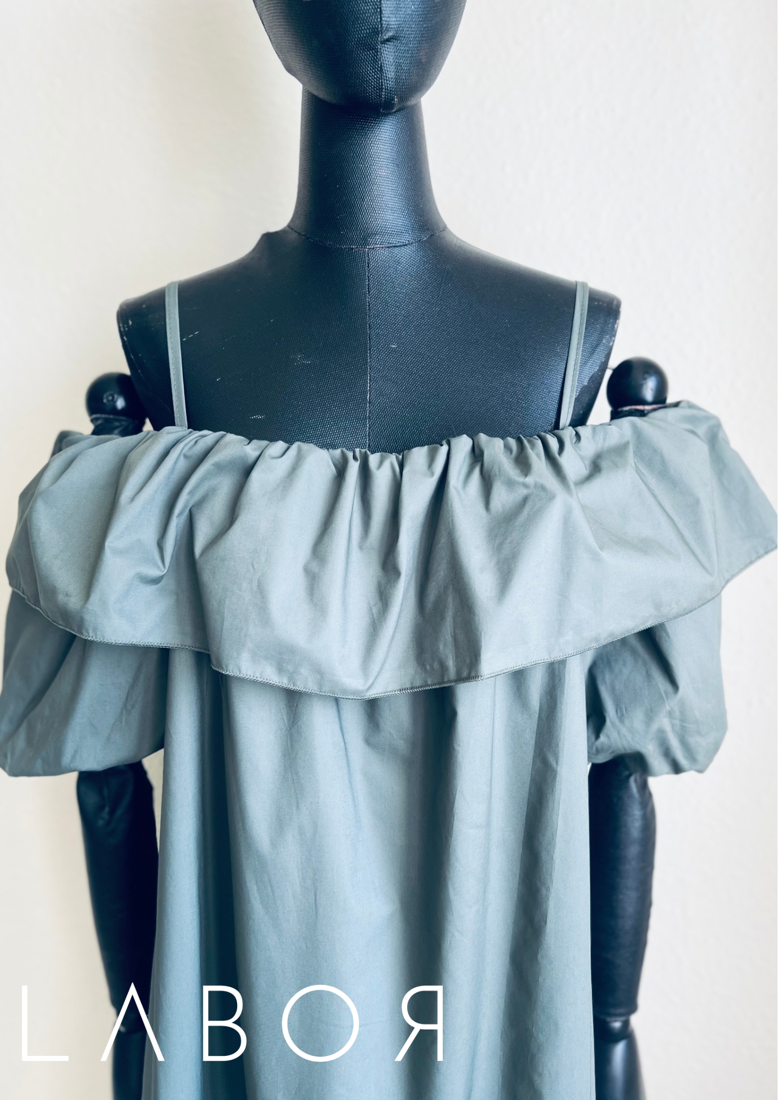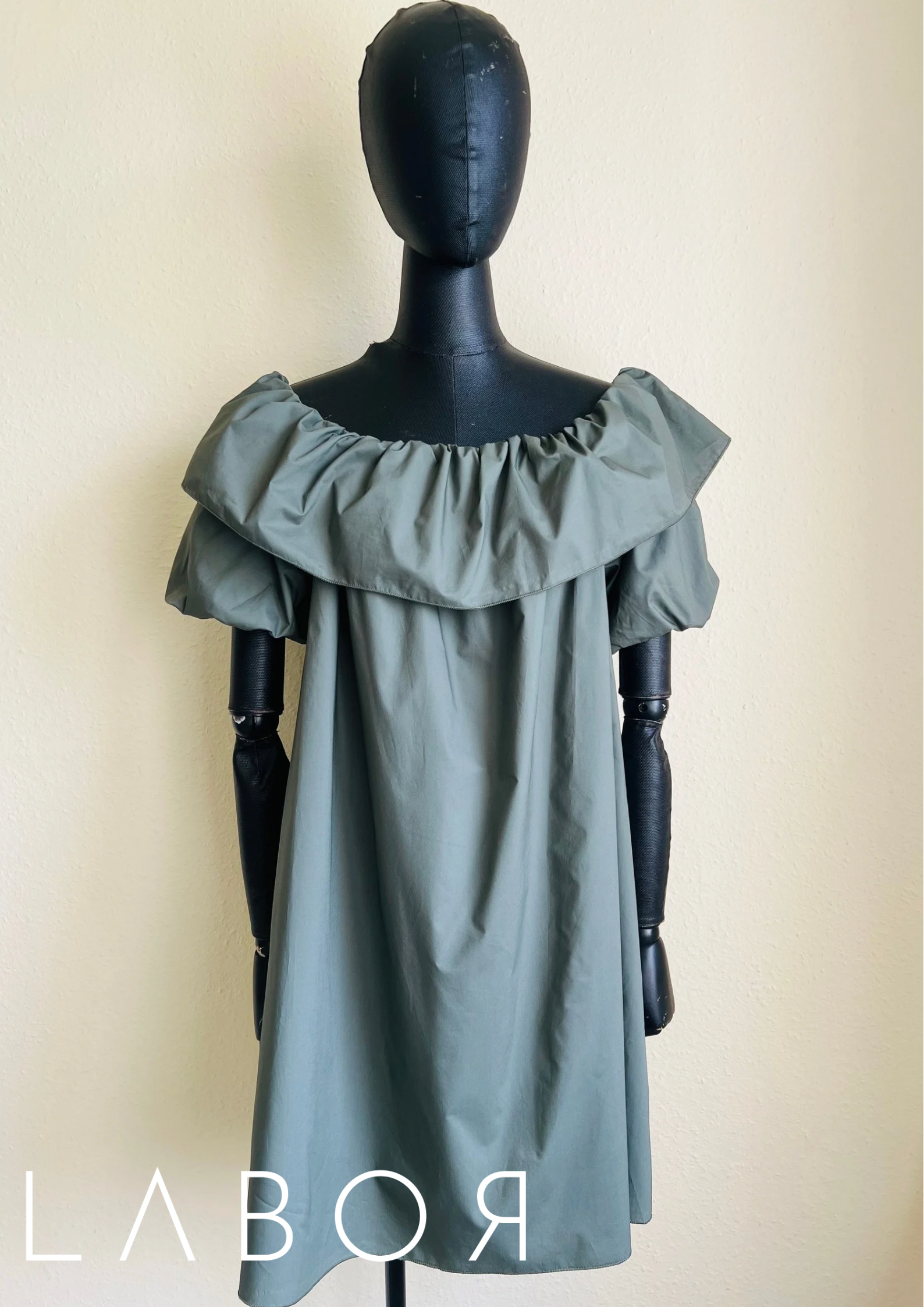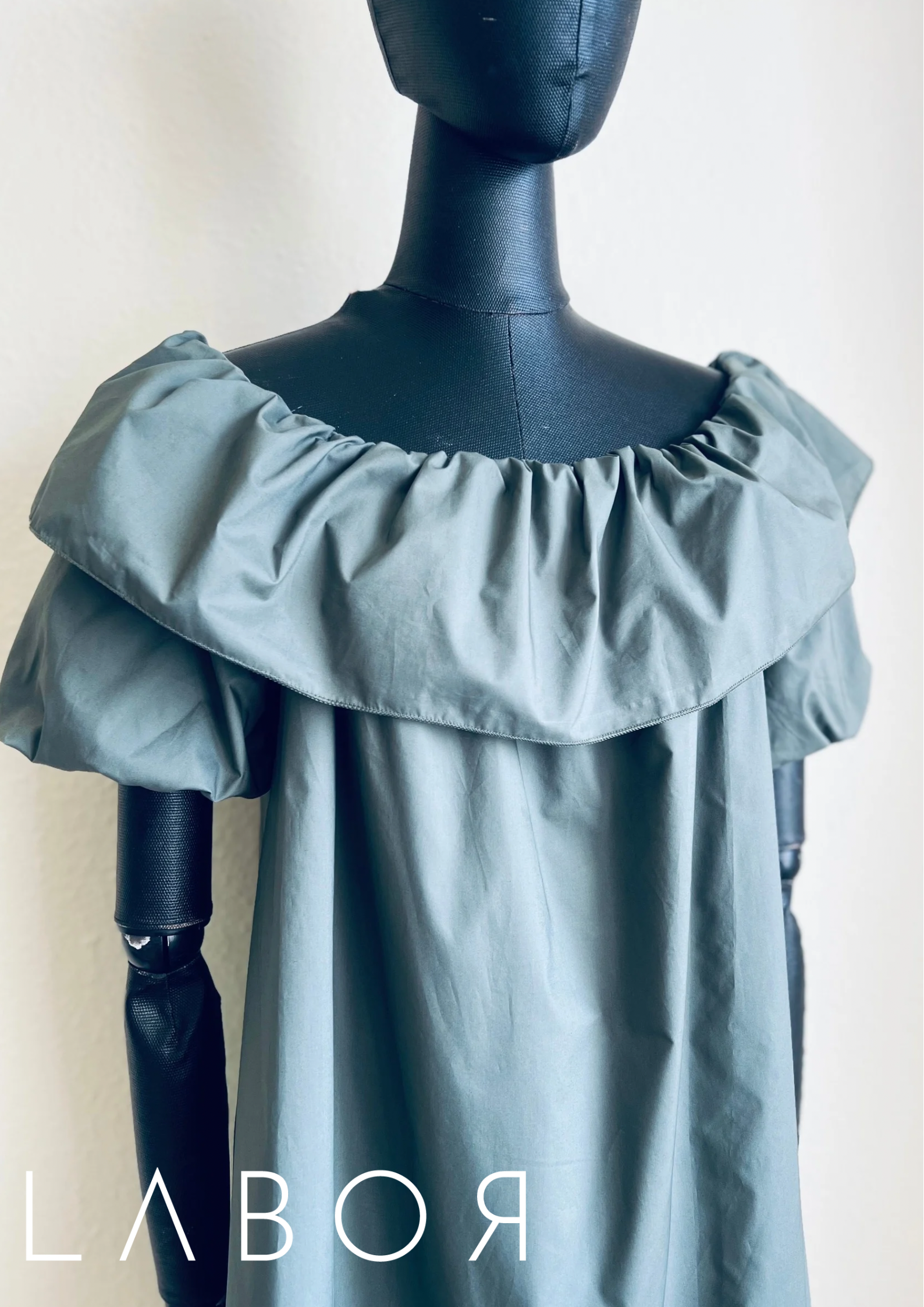 Különleges puplin anyagú ruha, amely többféleképpen variálható. Vékony pánttal, illetve galléros résszel ellátott felső része akár pántnélküli verzióban is viselhető. A gallér rész gumírozott.