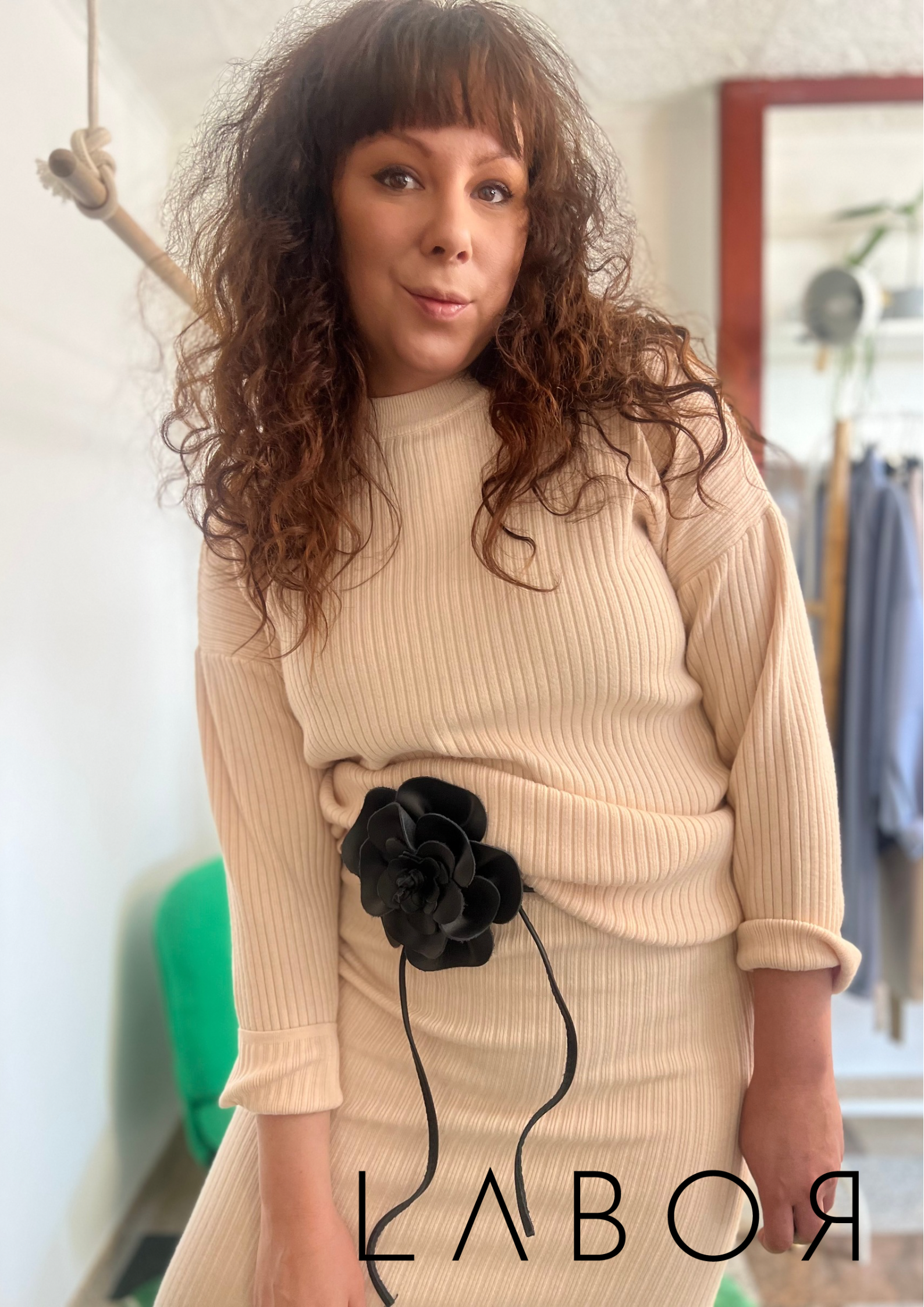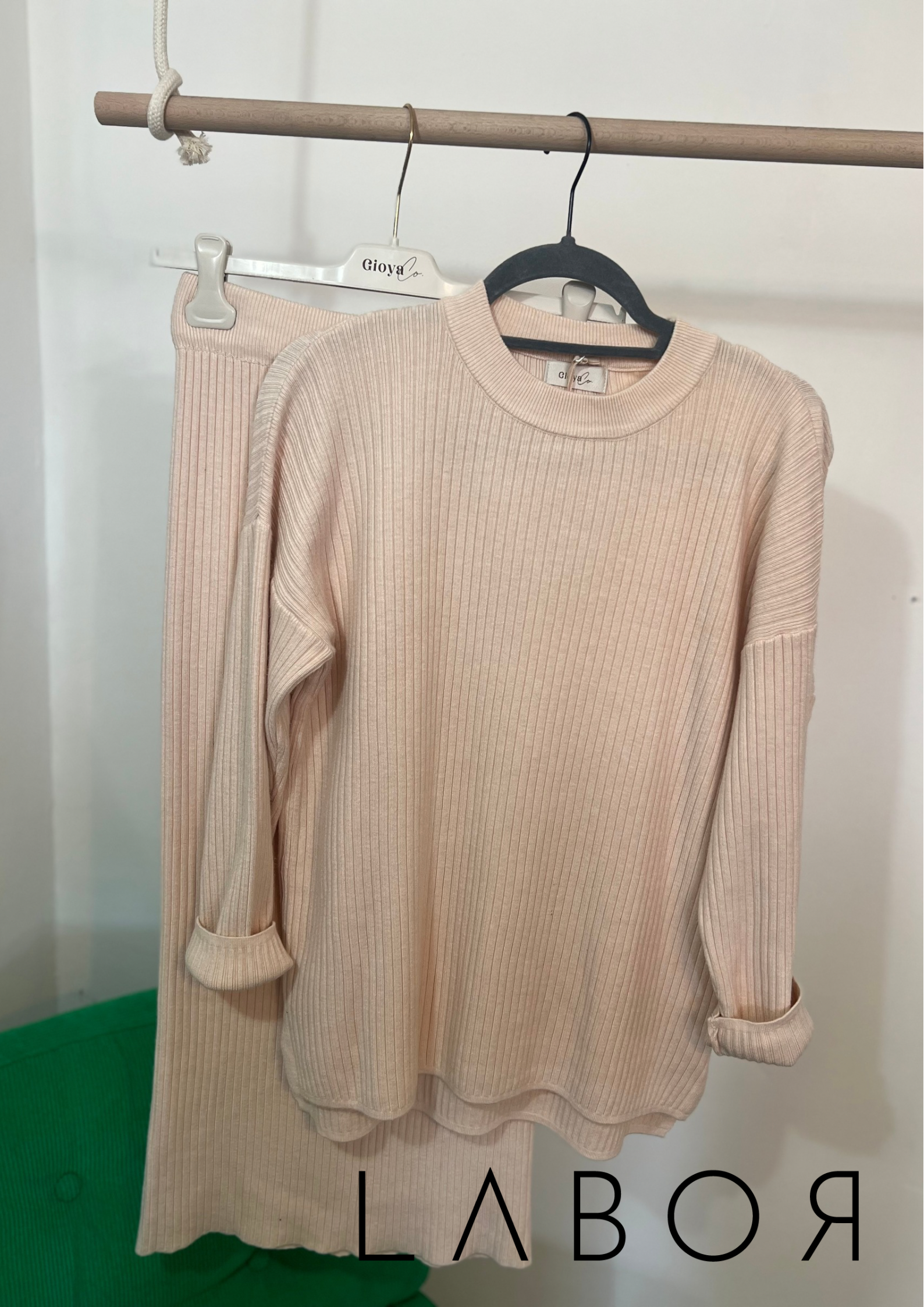 Kétrészes szett, amely egy oversize pulóverból és egy gumis derekú szoknyából áll. Bordázott rugalmas anyagból készült.