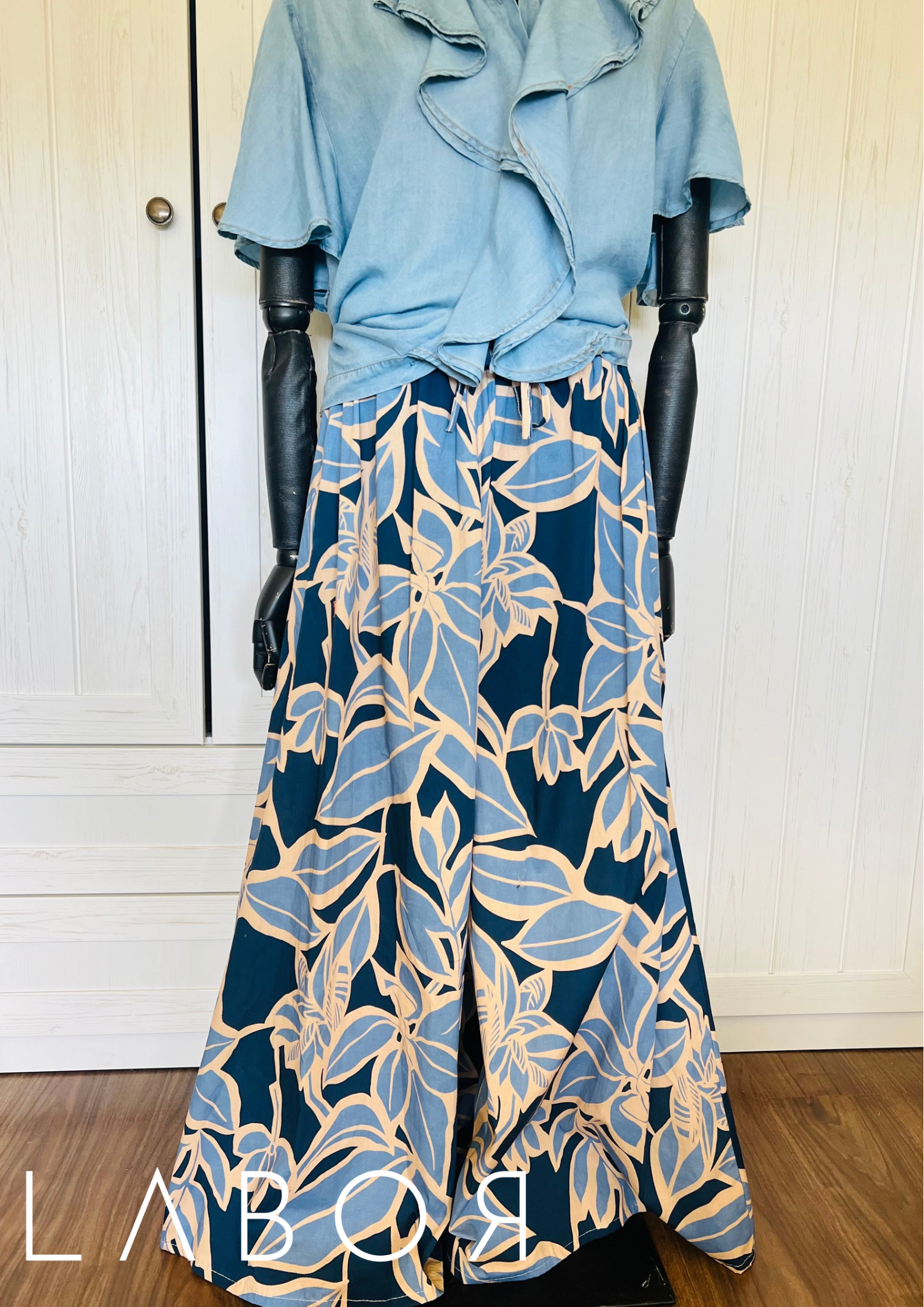 Lenge bő szárú nadrág gumis derékkal. Kényelmes könnyű anyagból készült.
