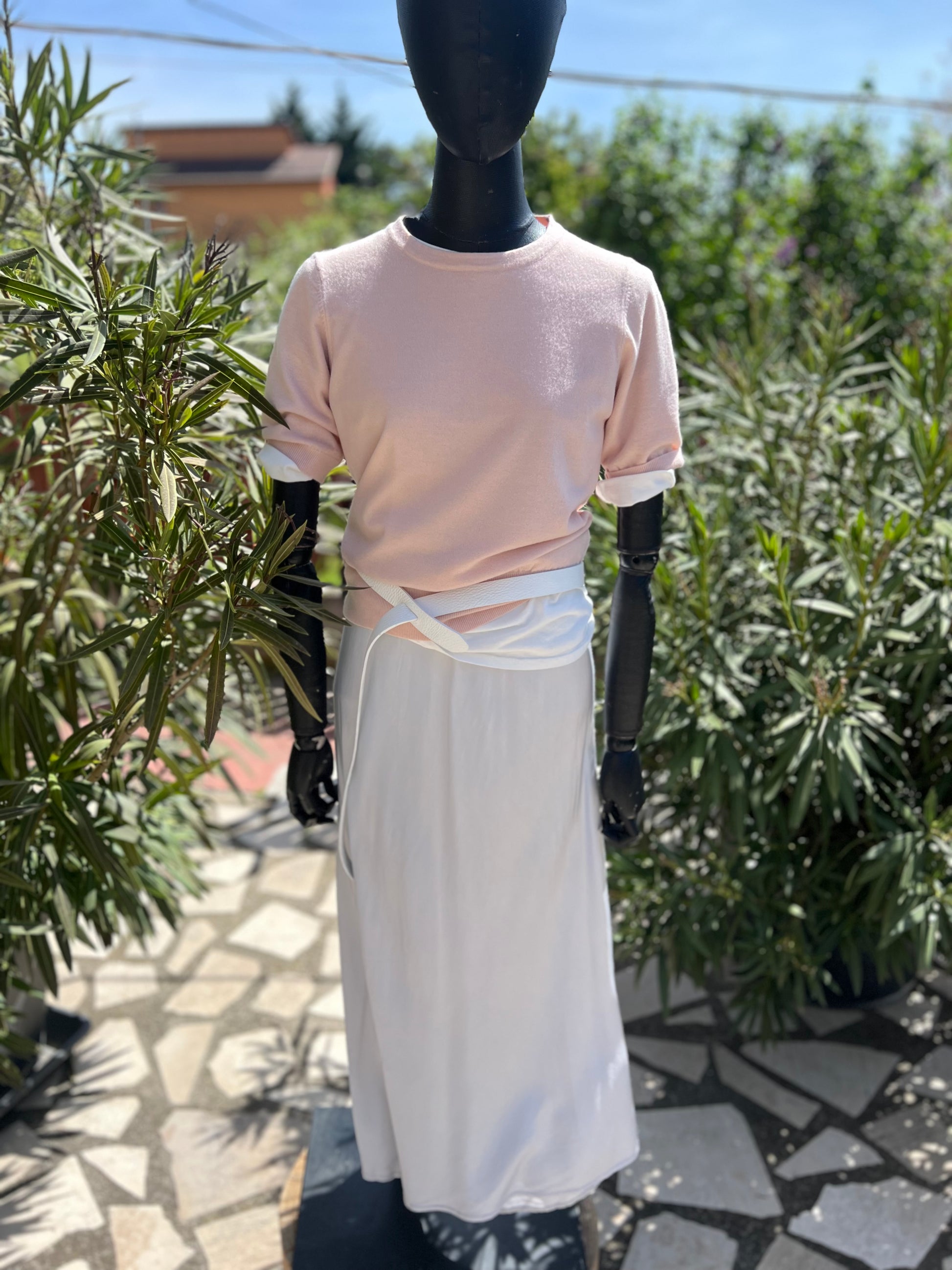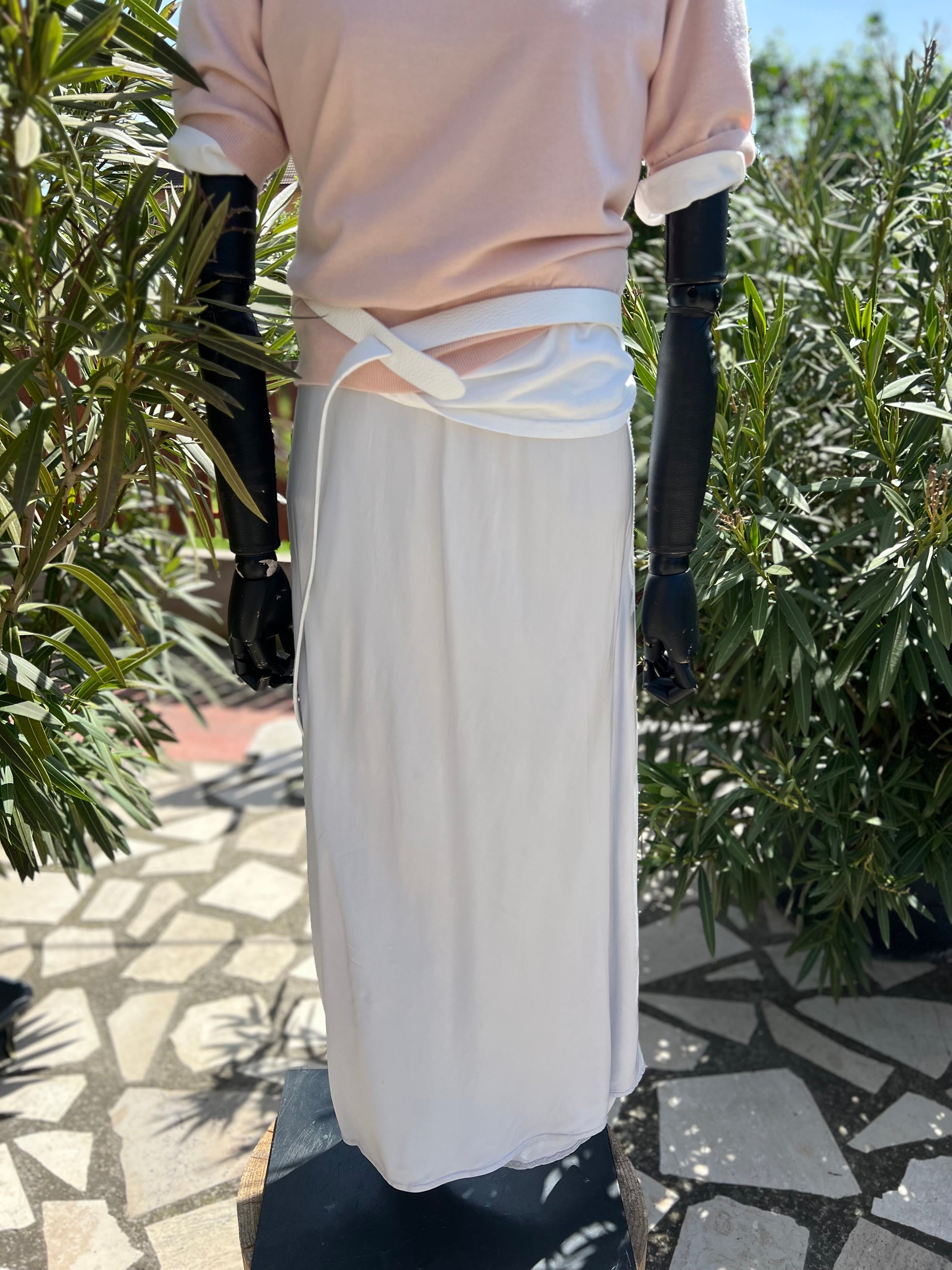 Szatén anyagú, könnyű lenge szoknya gumírozott derékrésszel.
