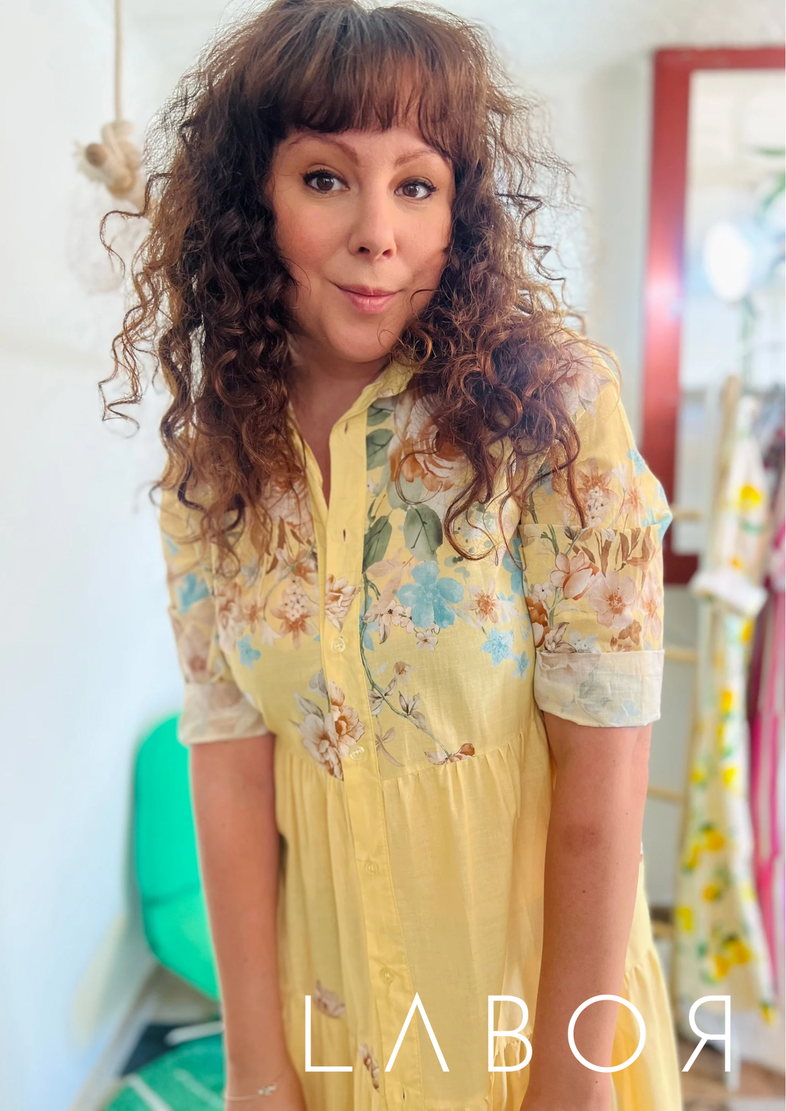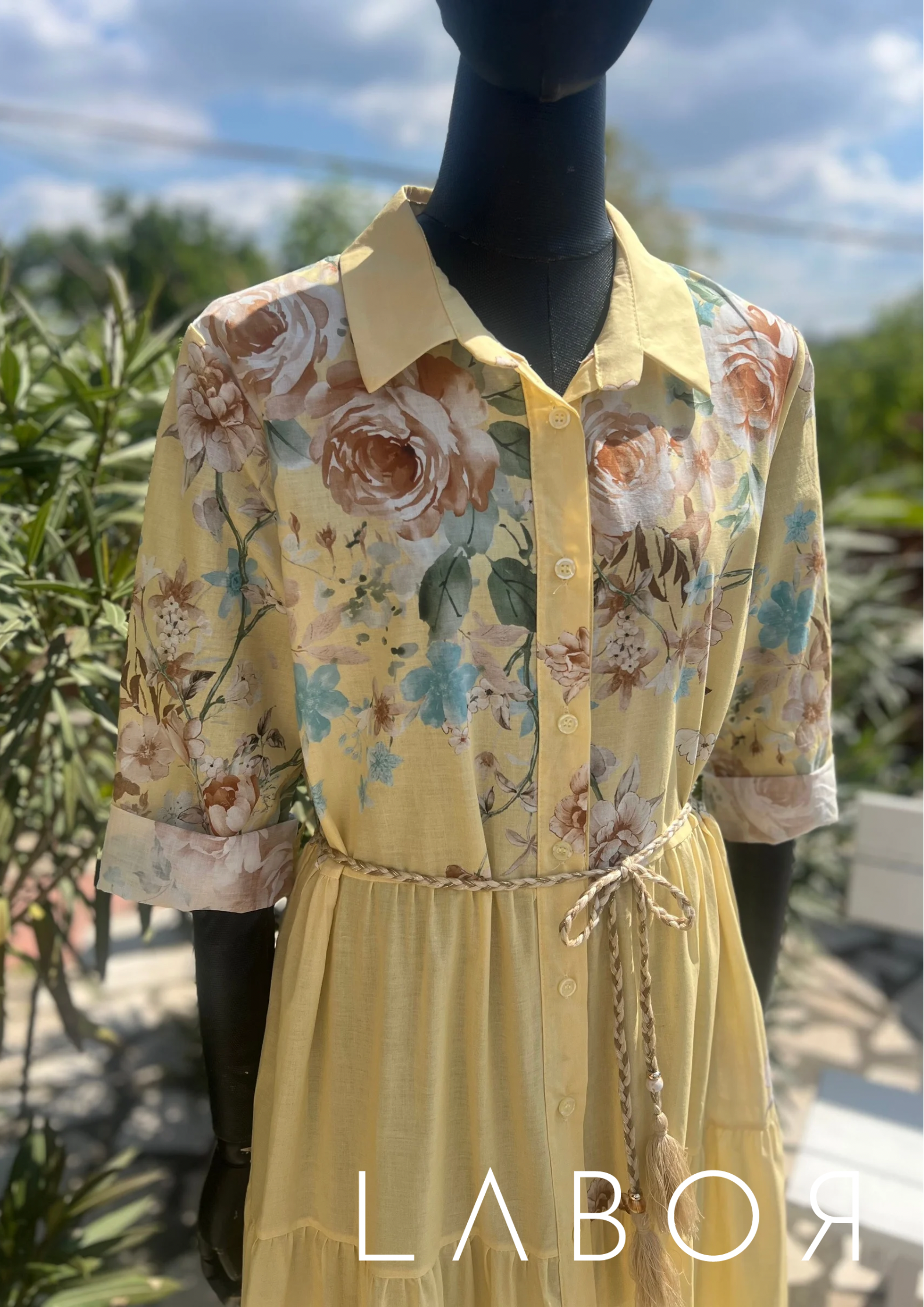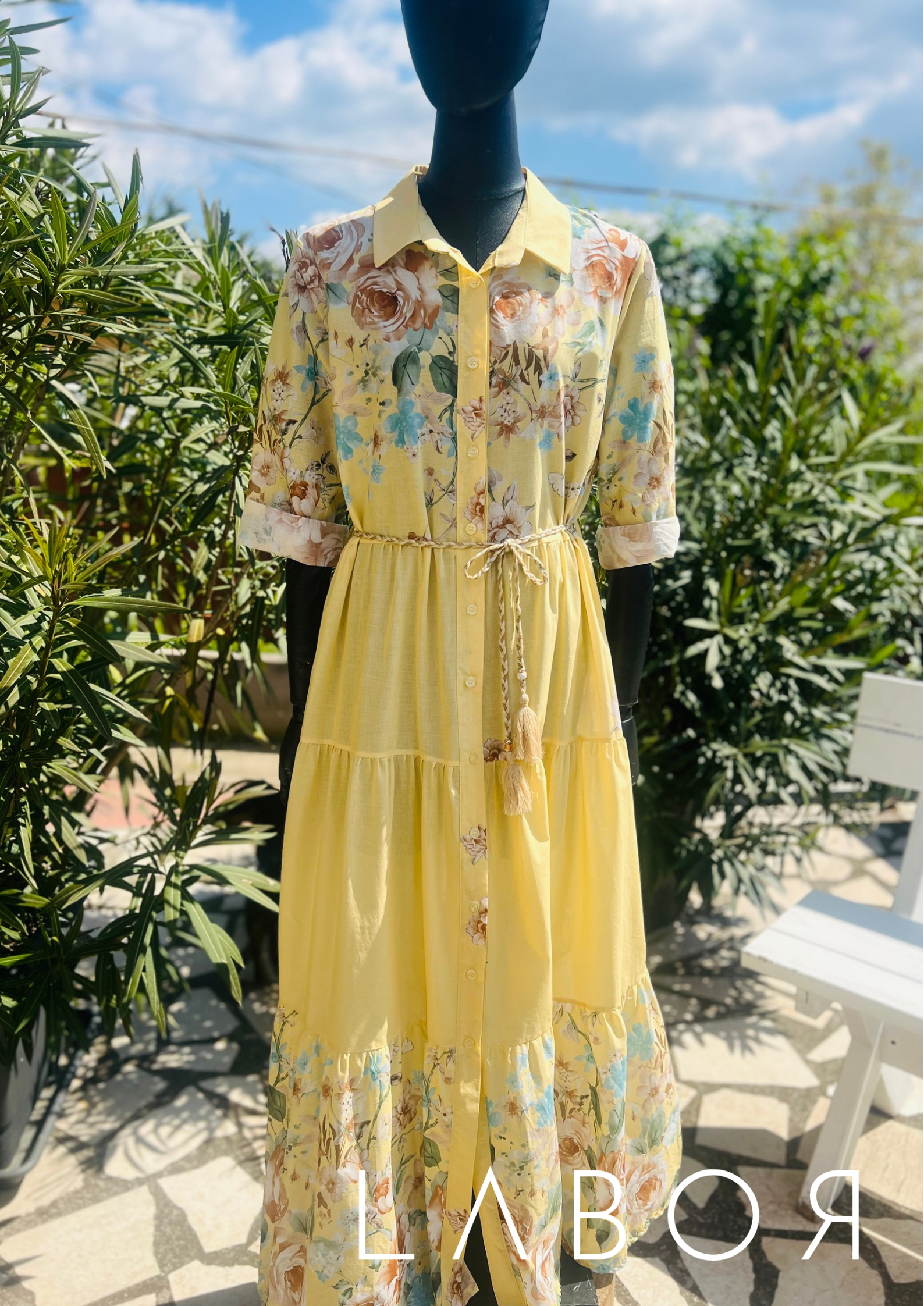 Lágy, lenge anyagból készült vajsárga maxiruha megkötővel. Virágokkal díszítve.